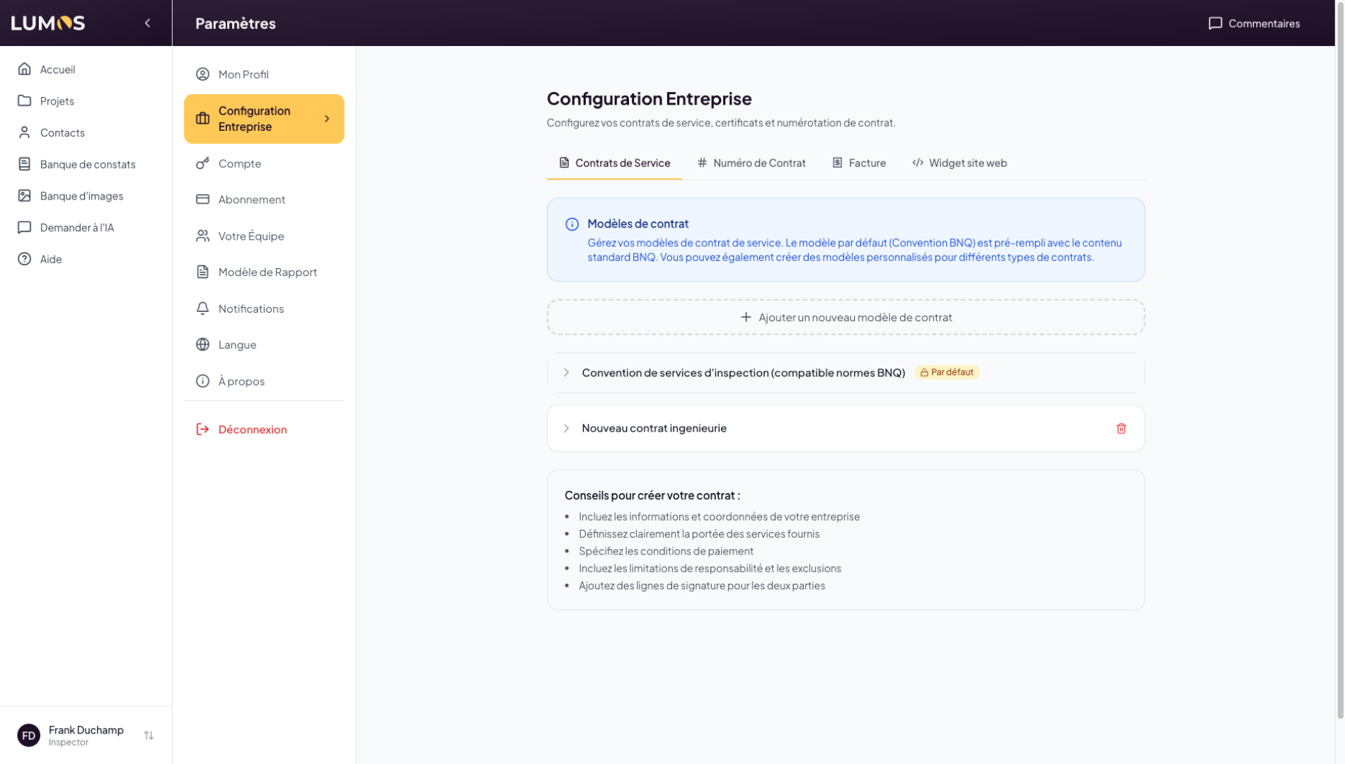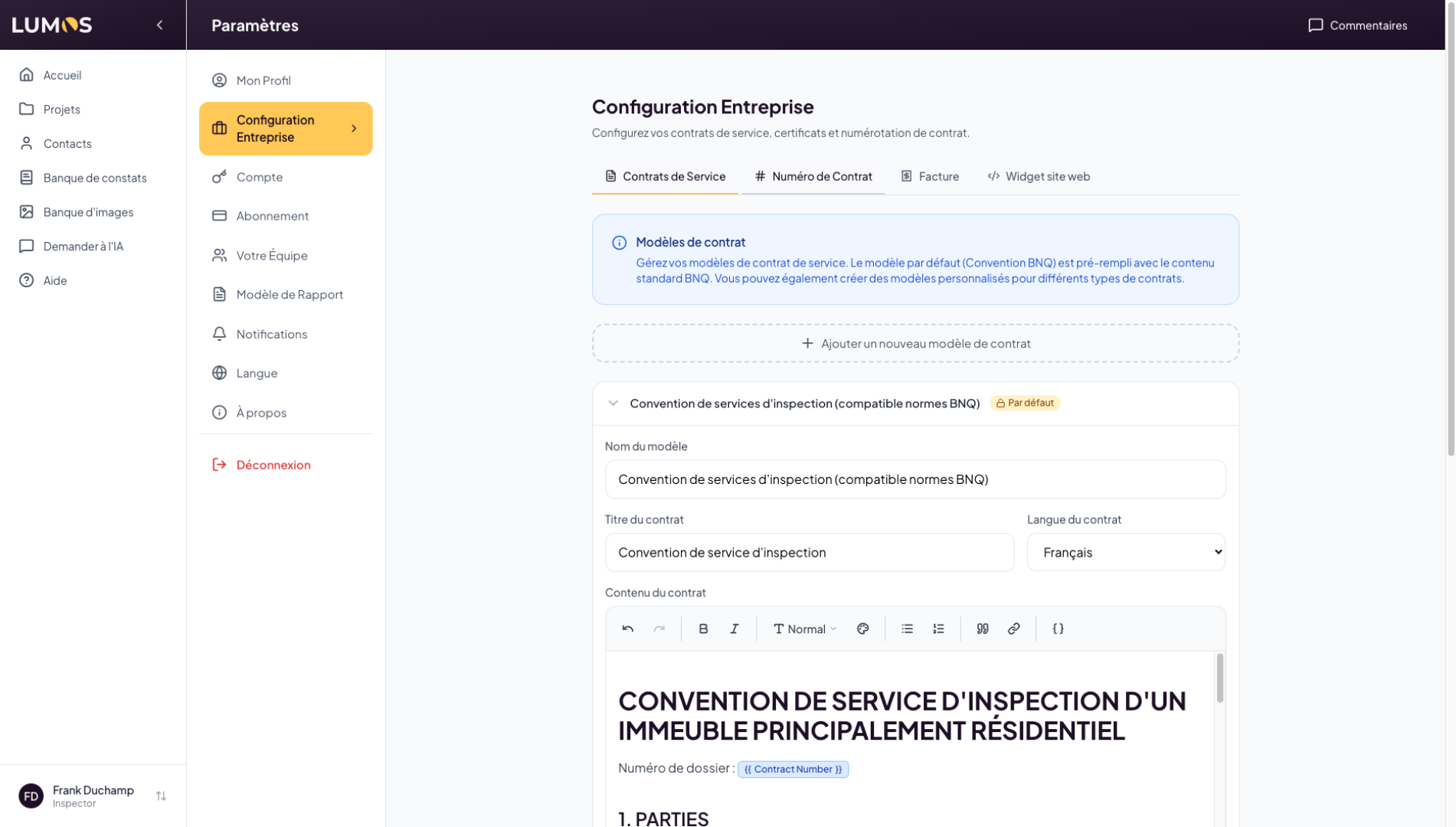 This section allows you to manage your service agreements or contracts. Lumos comes with a default contract template compliant with the BNQ standard, but you can easily create your own.