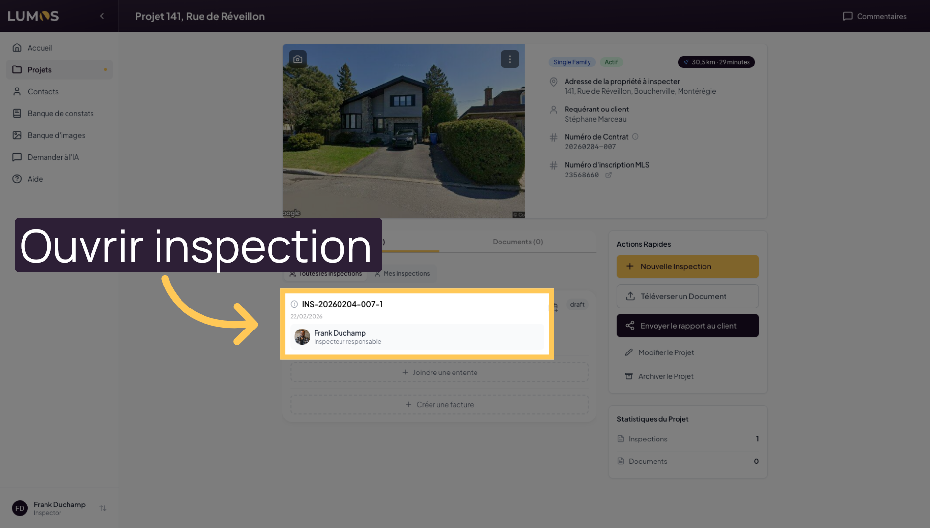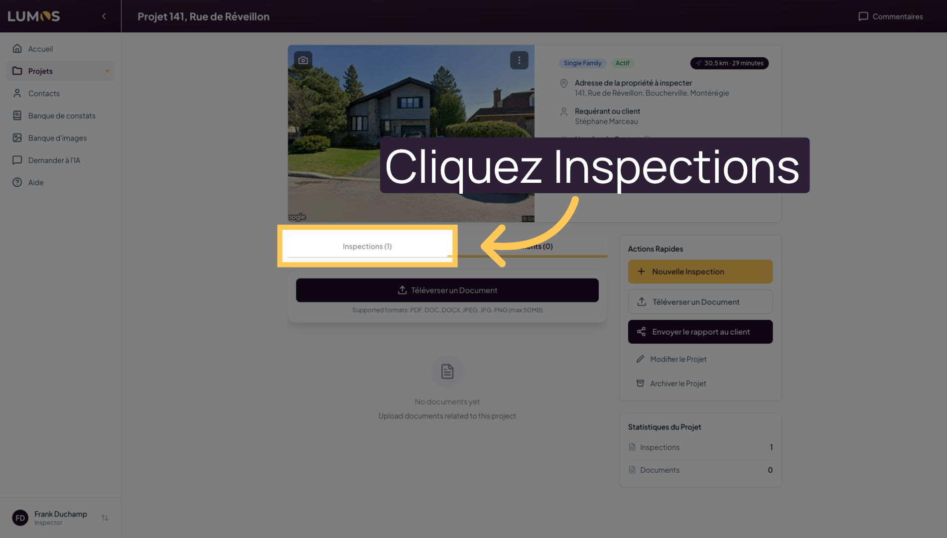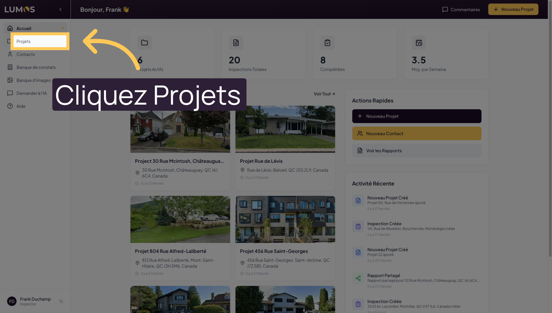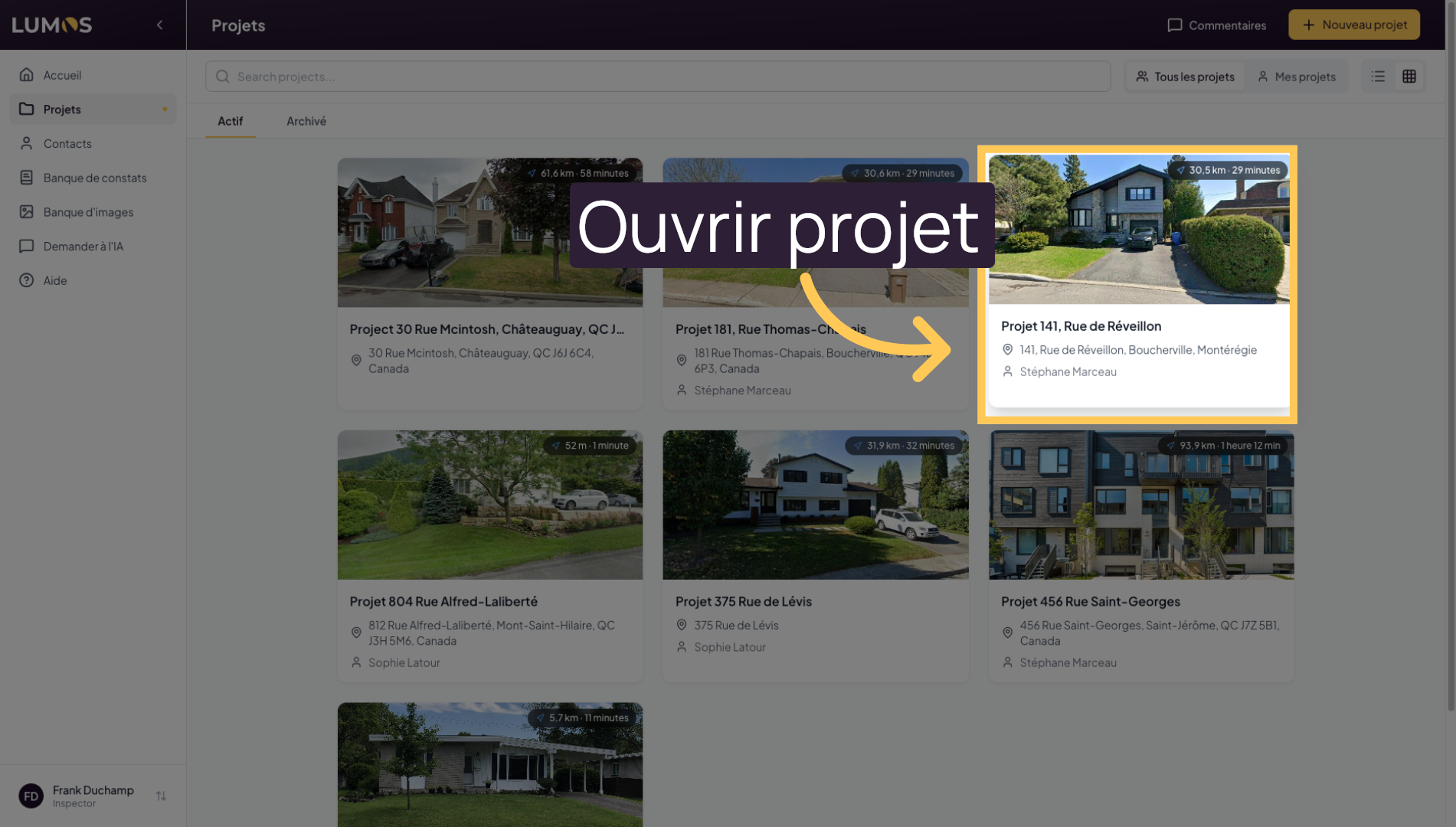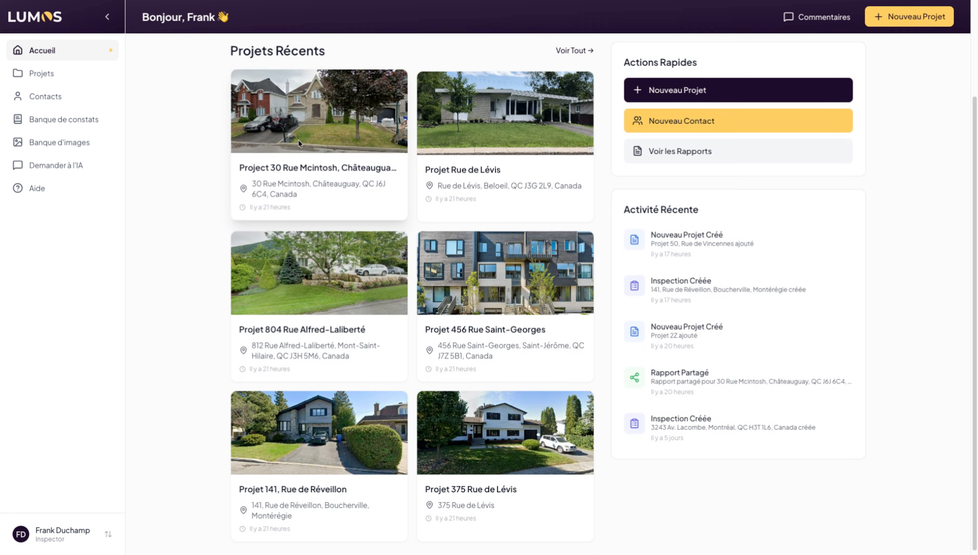 Click on “Projects” to access your list of ongoing projects and manage your inspections. You can create one project per address to inspect, but each project can contain multiple inspections.