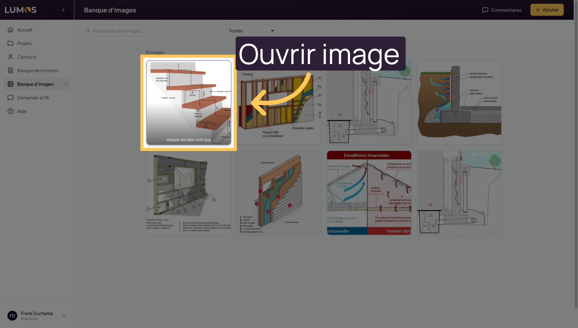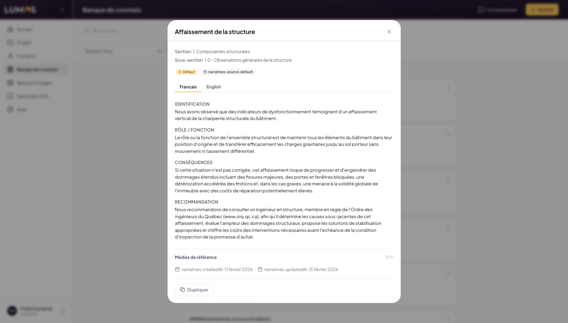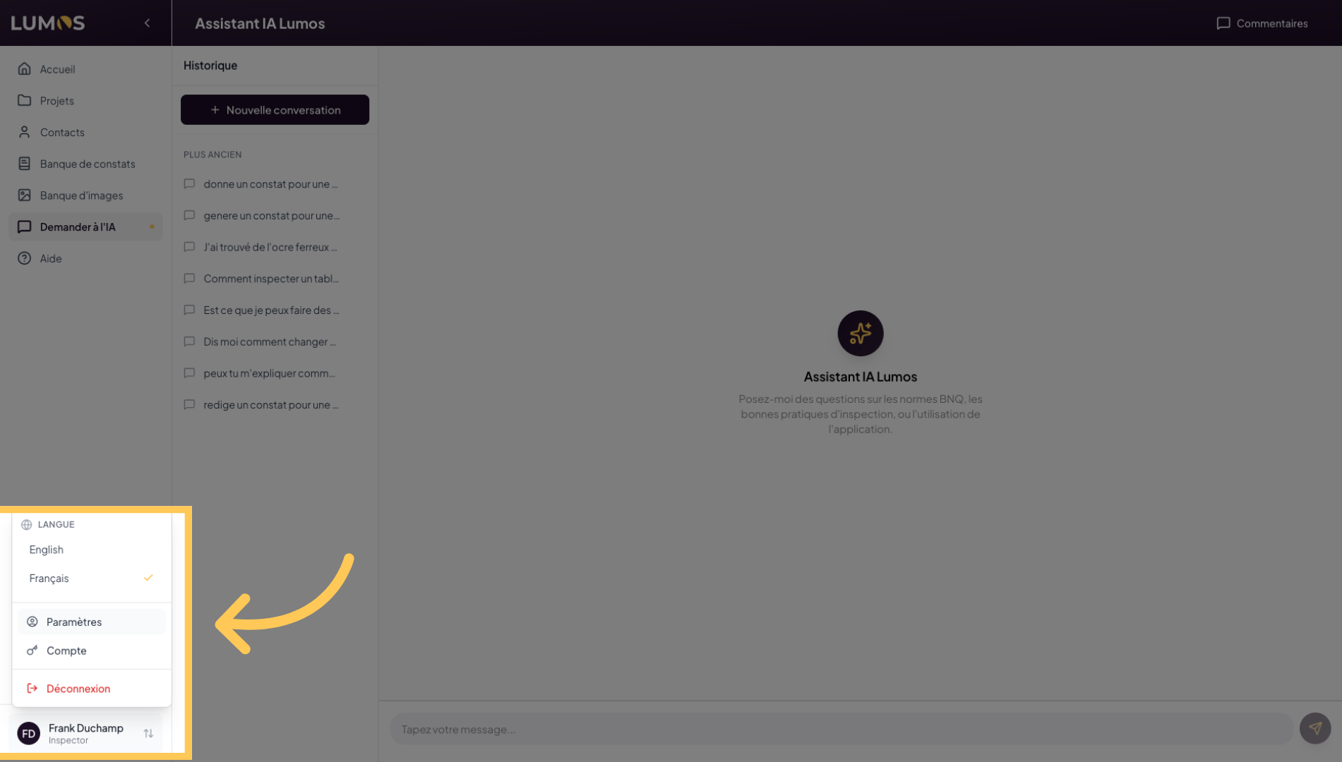 Lumos Inspection comes with a built-in artificial intelligence. It is trained and specialized in building inspections, with access to the building code, civil code, and current standards such as the BNQ standard. You can ask technical questions or request help writing your findings.