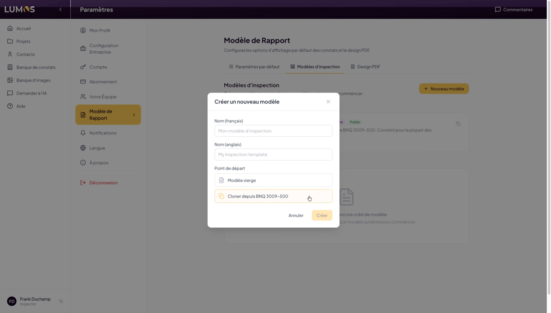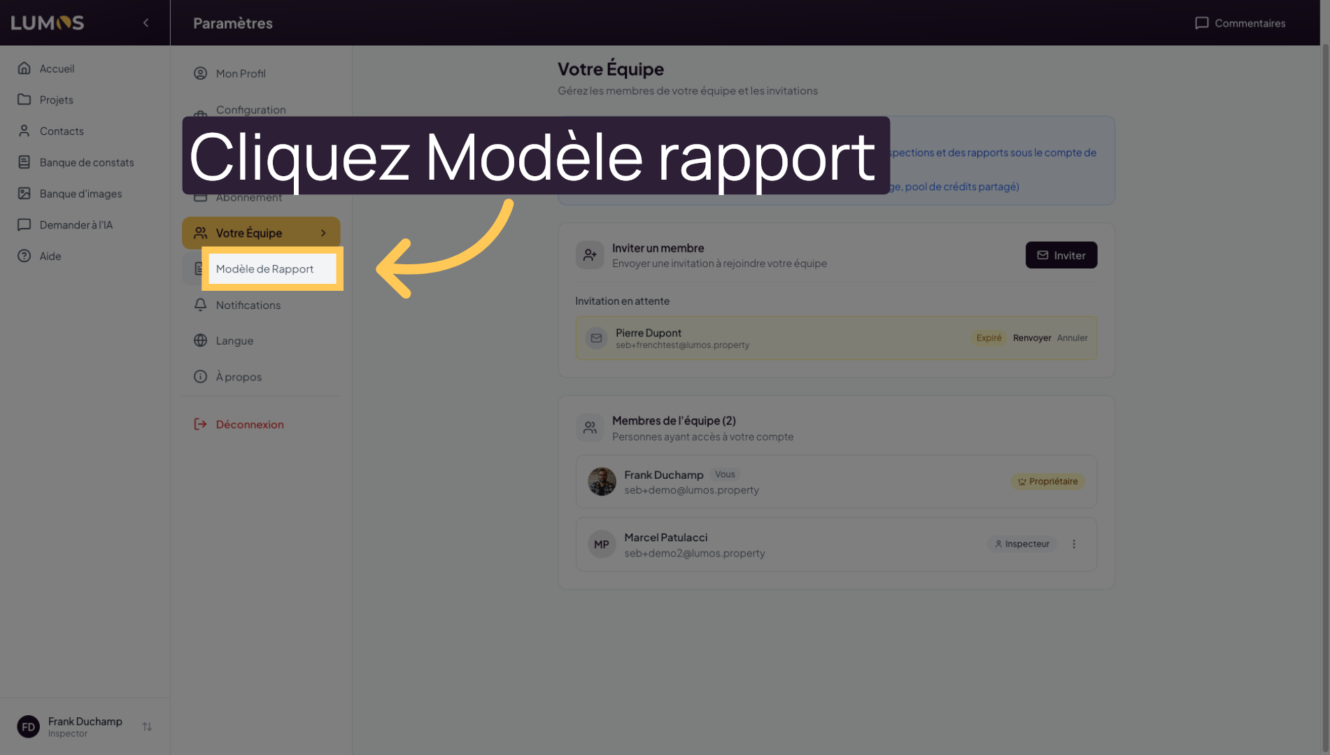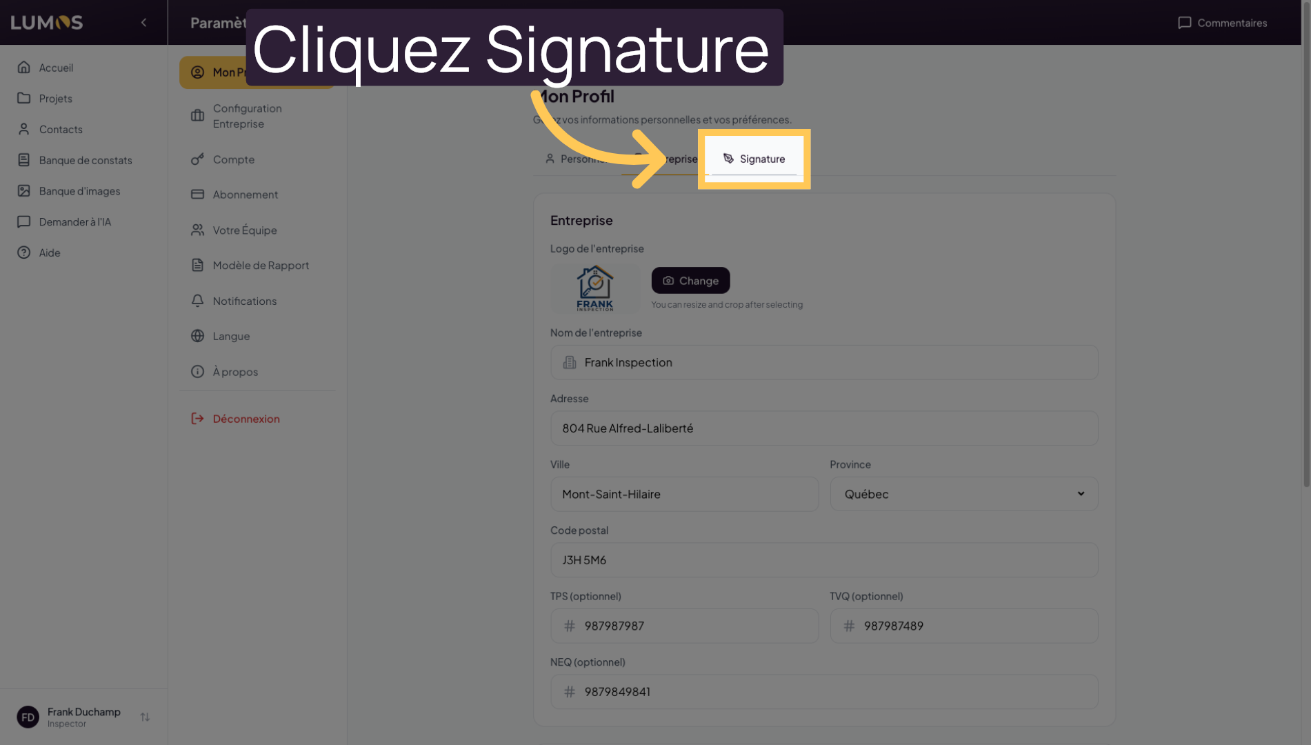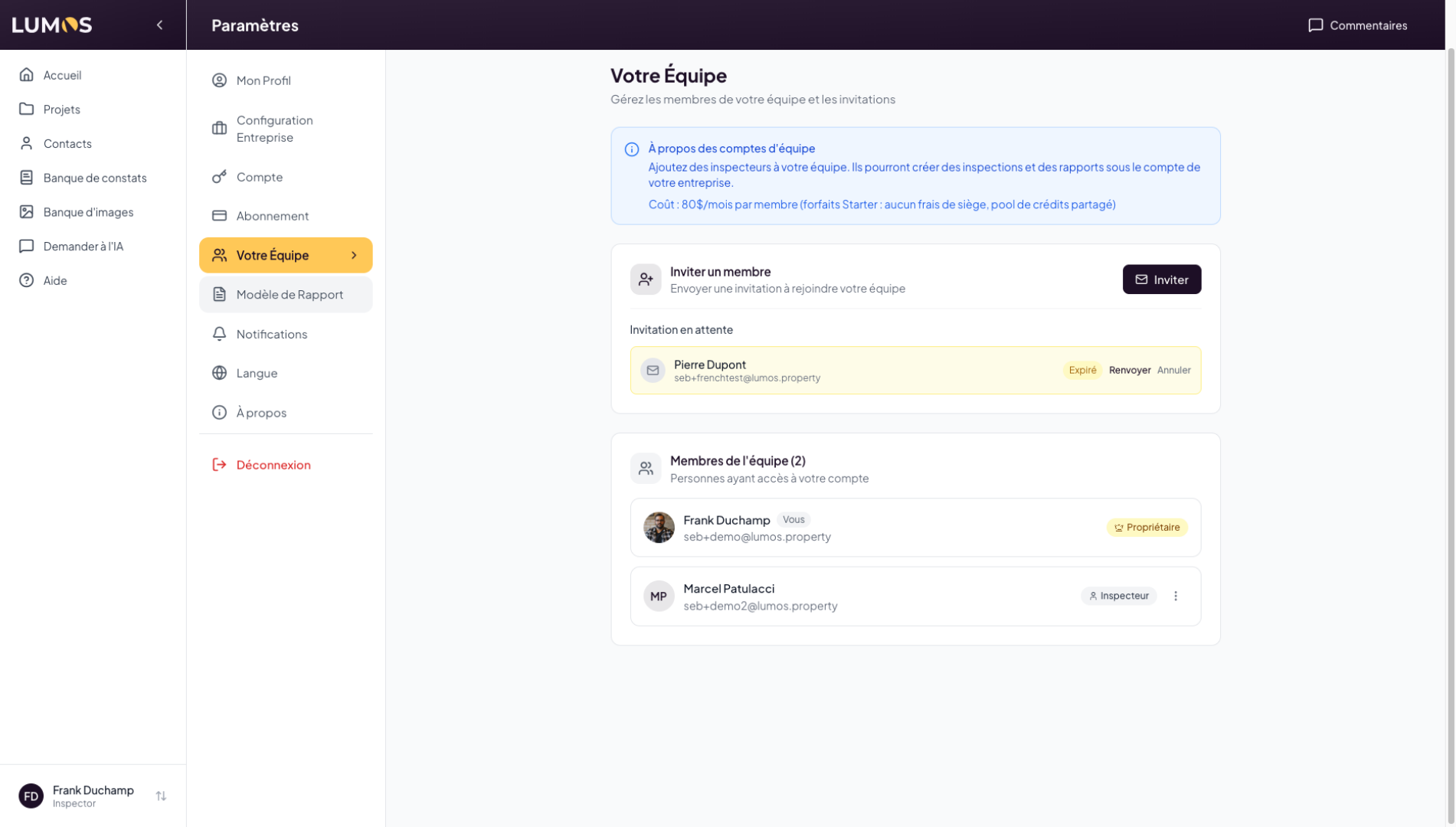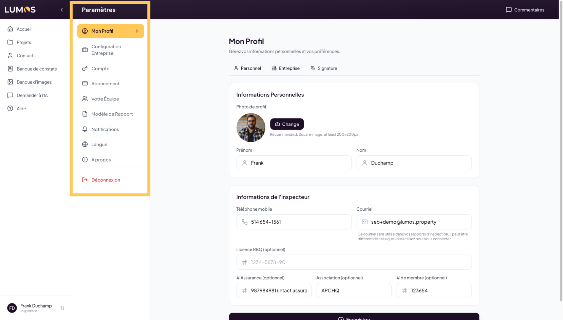 This is where you configure Lumos Inspection. In the submenu, access your profile information, your inspection company details, account and subscription management, team member management, inspection report settings, and much more.