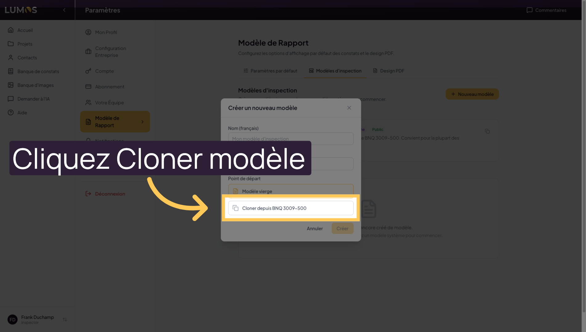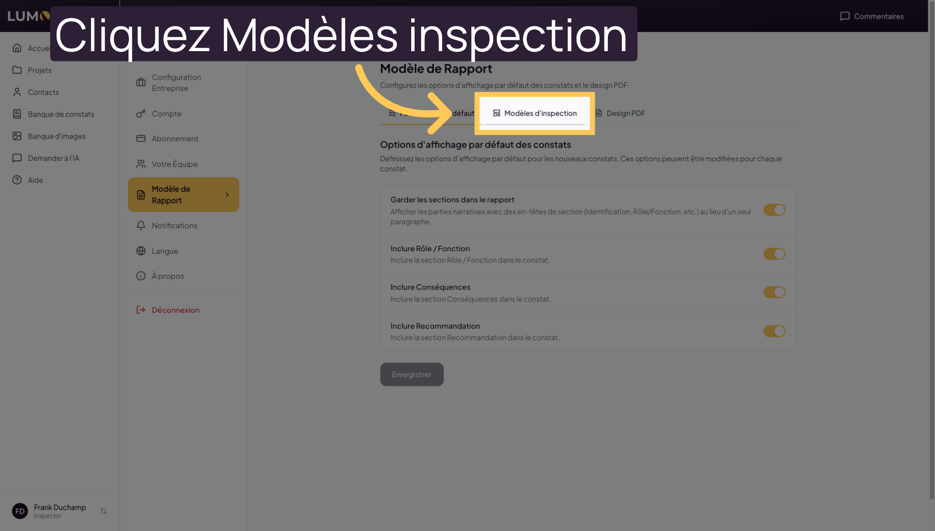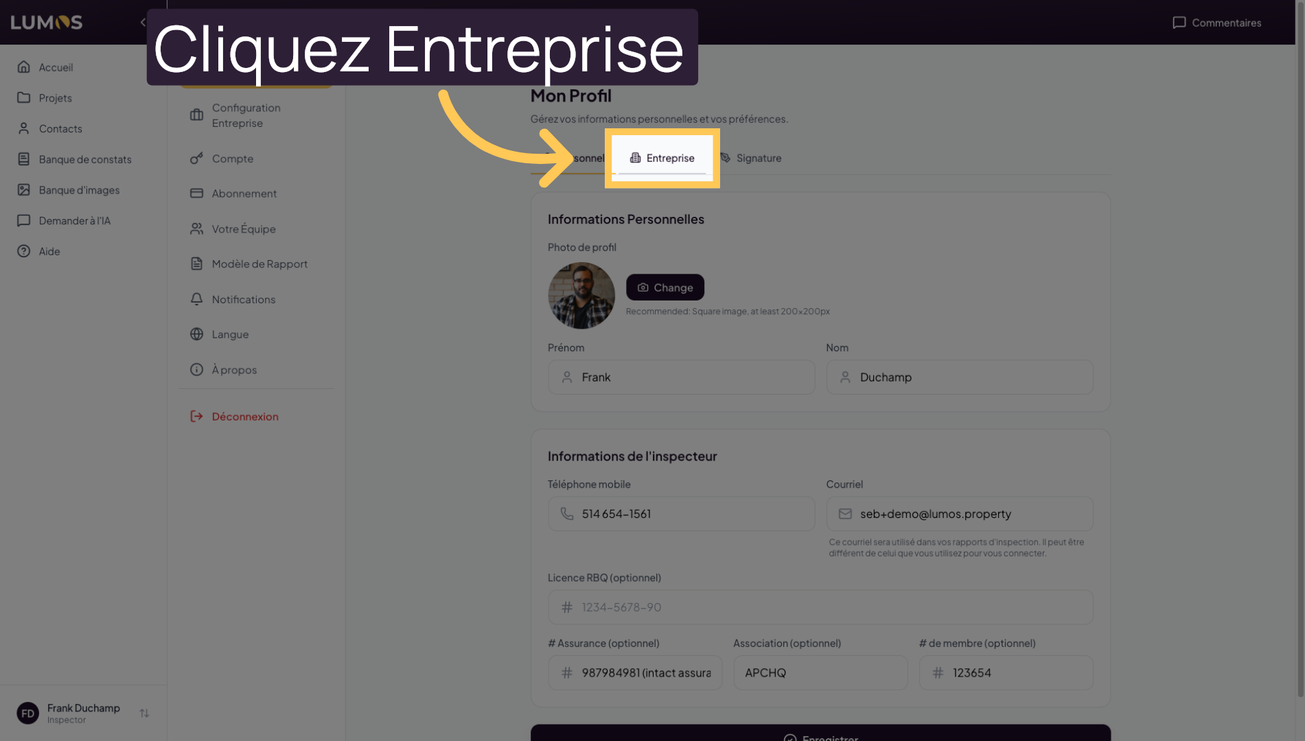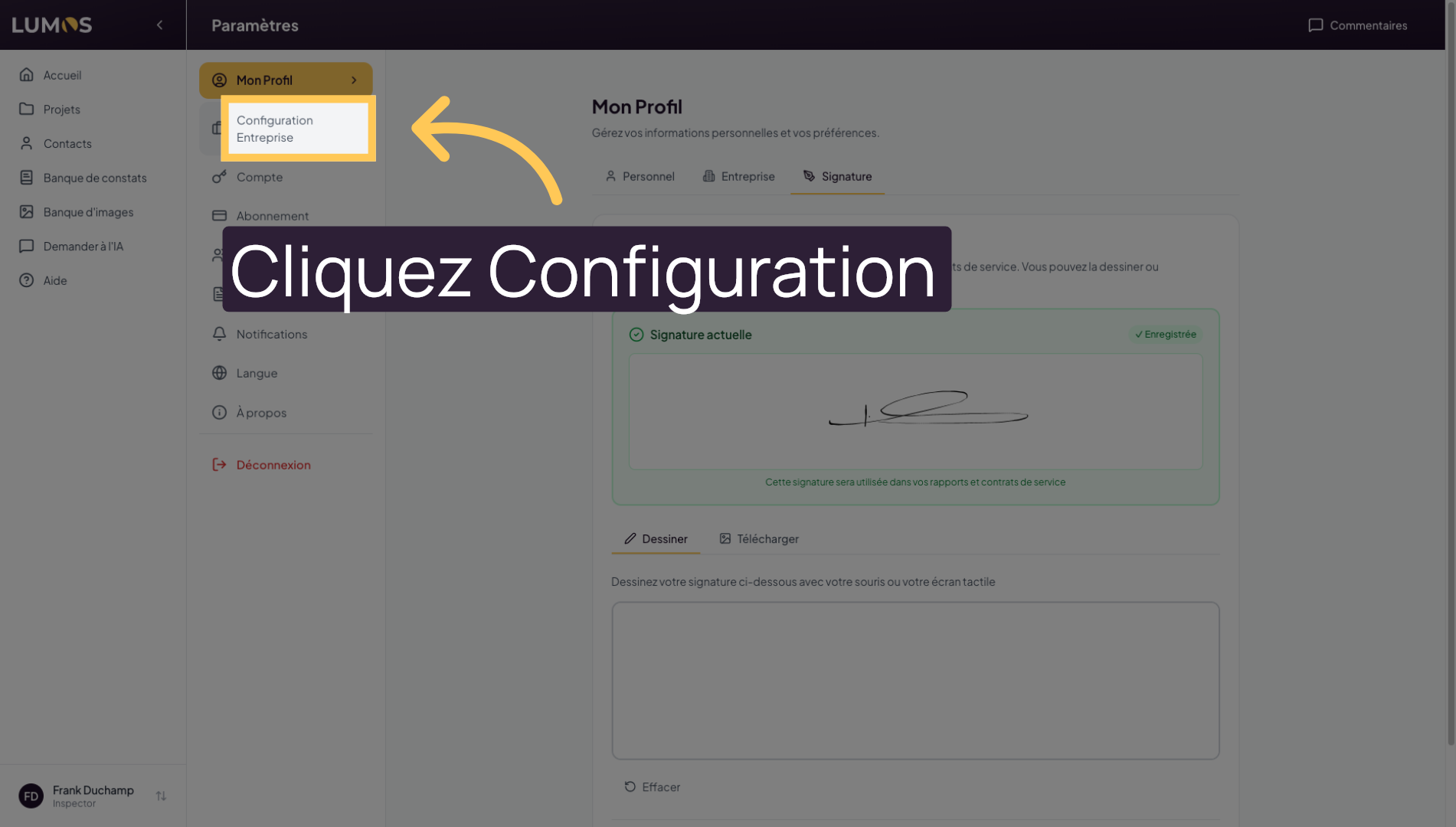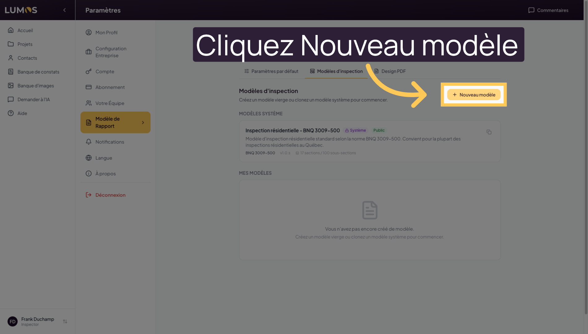 This is where you configure Lumos Inspection. In the submenu, access your profile information, your inspection company details, account and subscription management, team member management, inspection report settings, and much more.