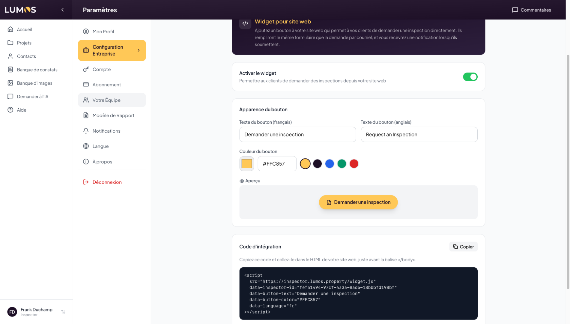 Click on “Website Widget” to customize the Lumos Inspection integration on your website.