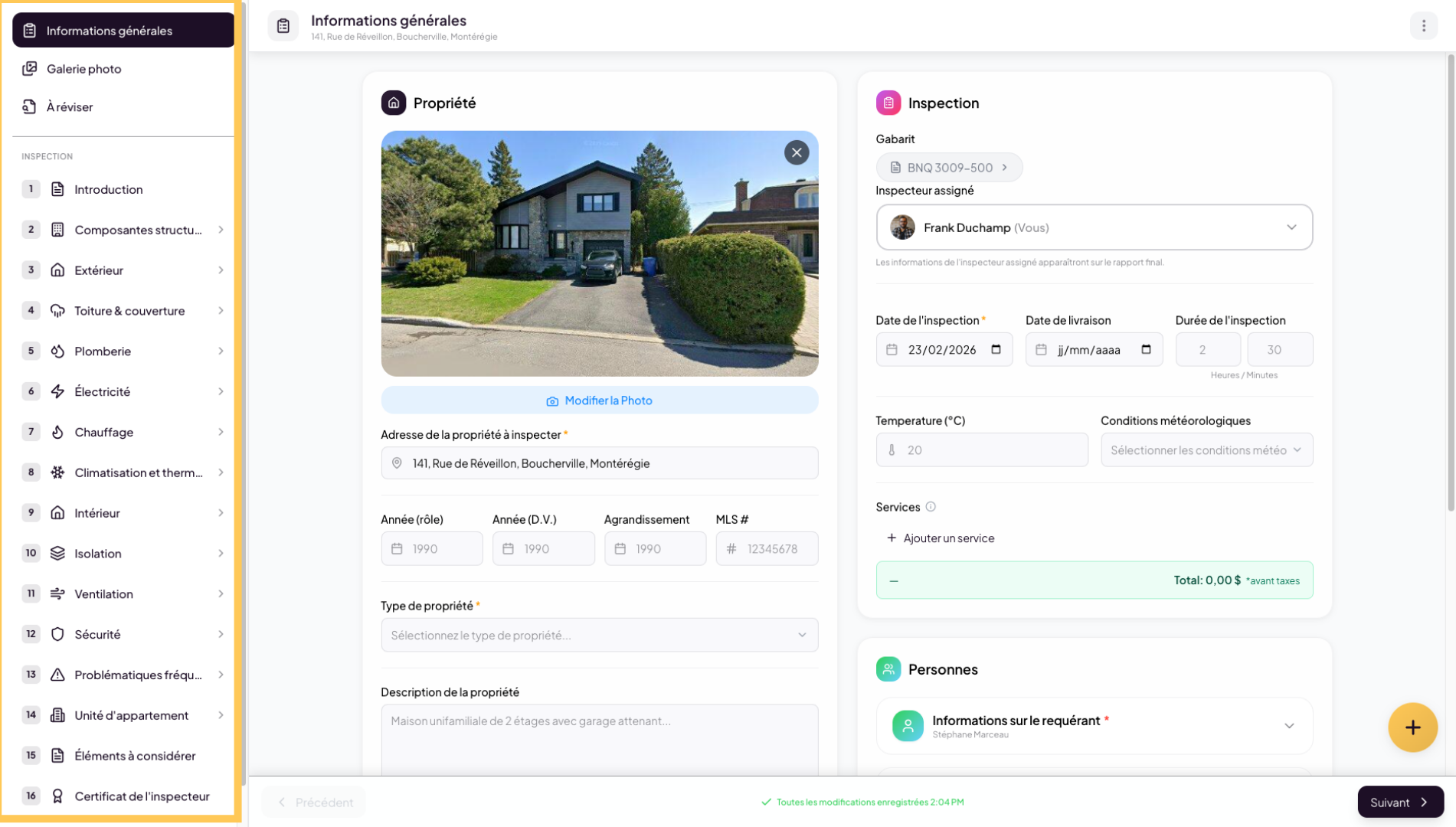 This is where you will build your inspection report. On the left side, you will find the main navigation with the photo gallery, building sections and components, and much more.