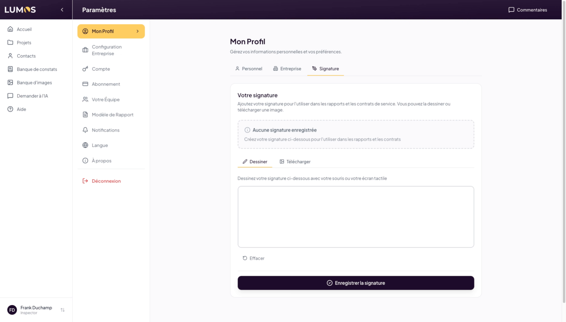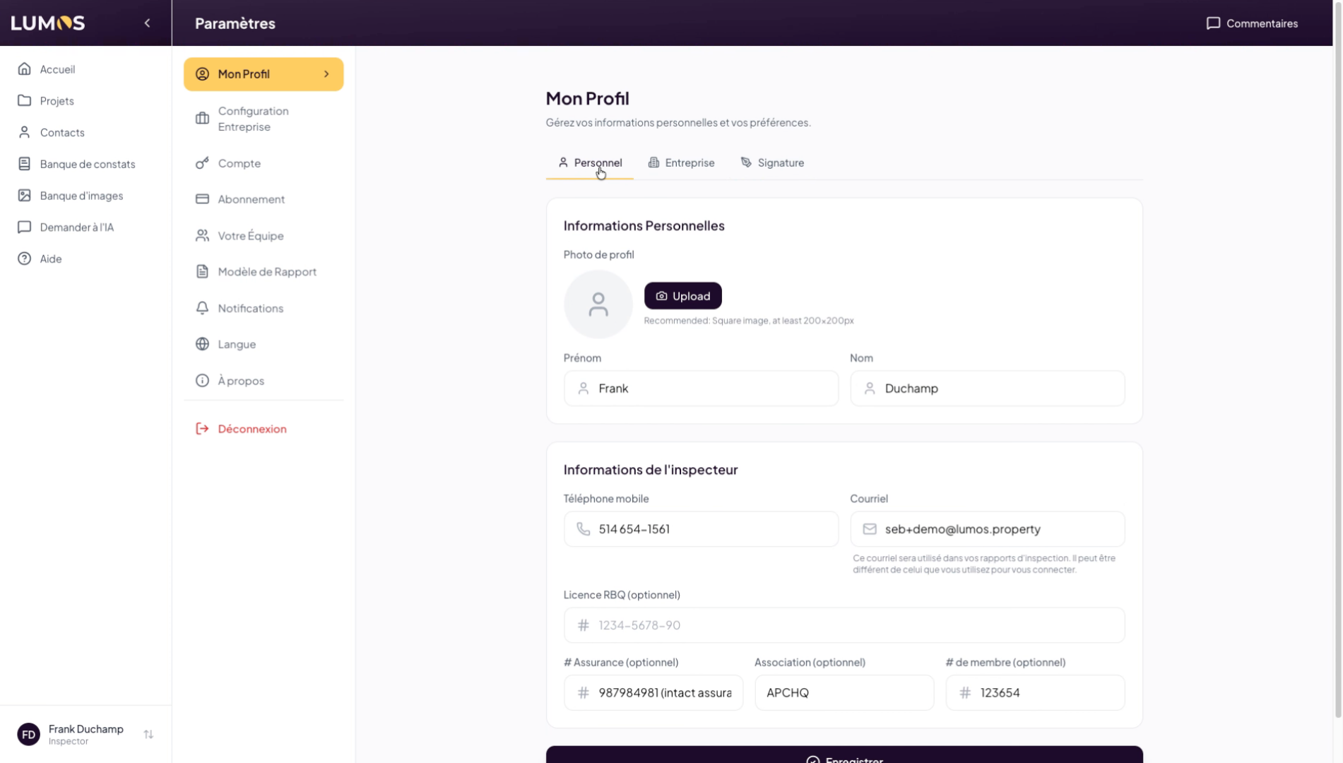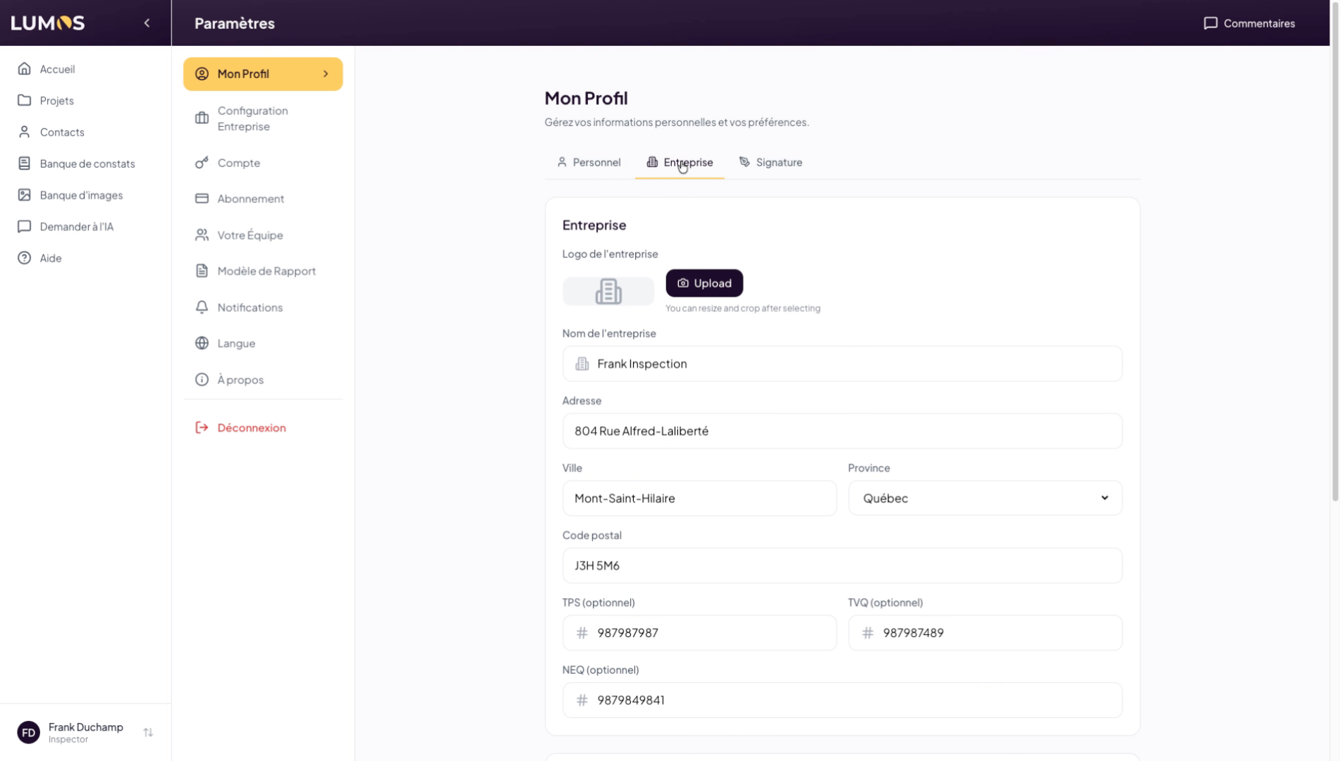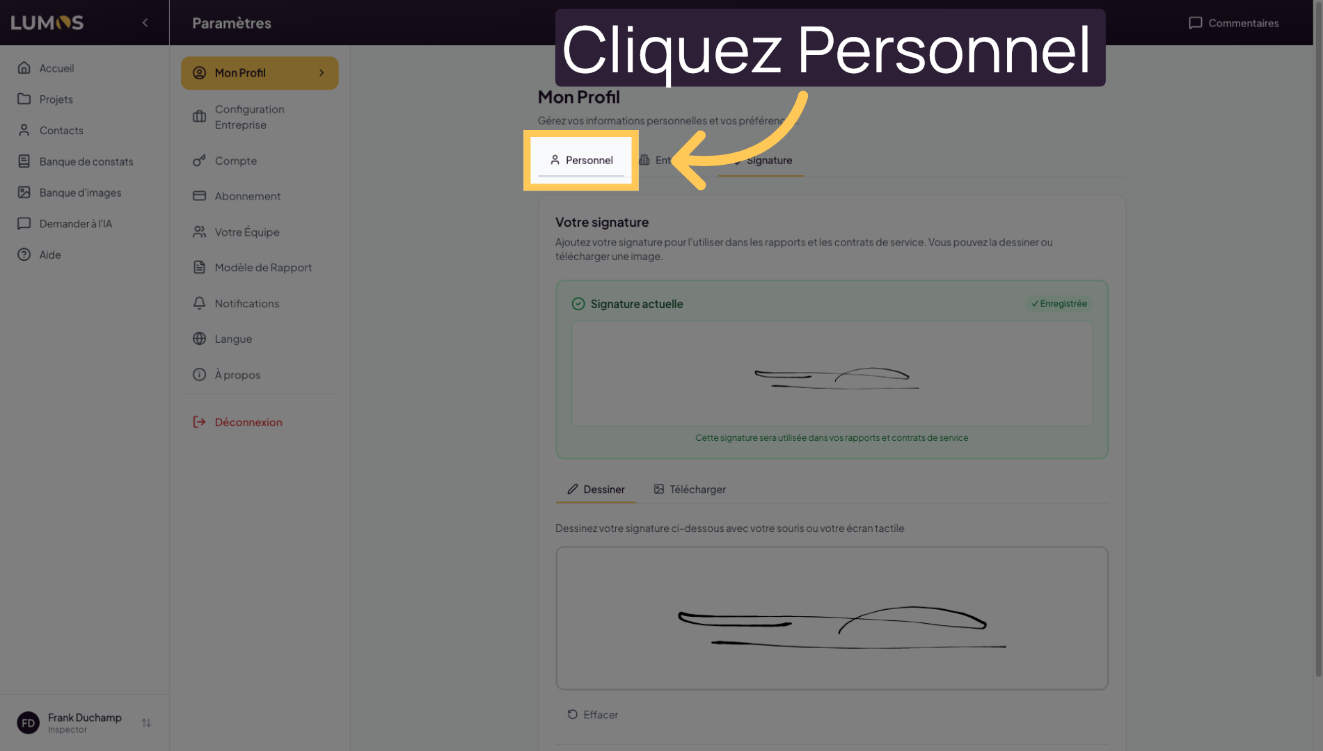 This tutorial guides you through configuring your Lumos account and profile. You will learn how to customize your information, add a signature, a logo, and manage your contracts and preferences.