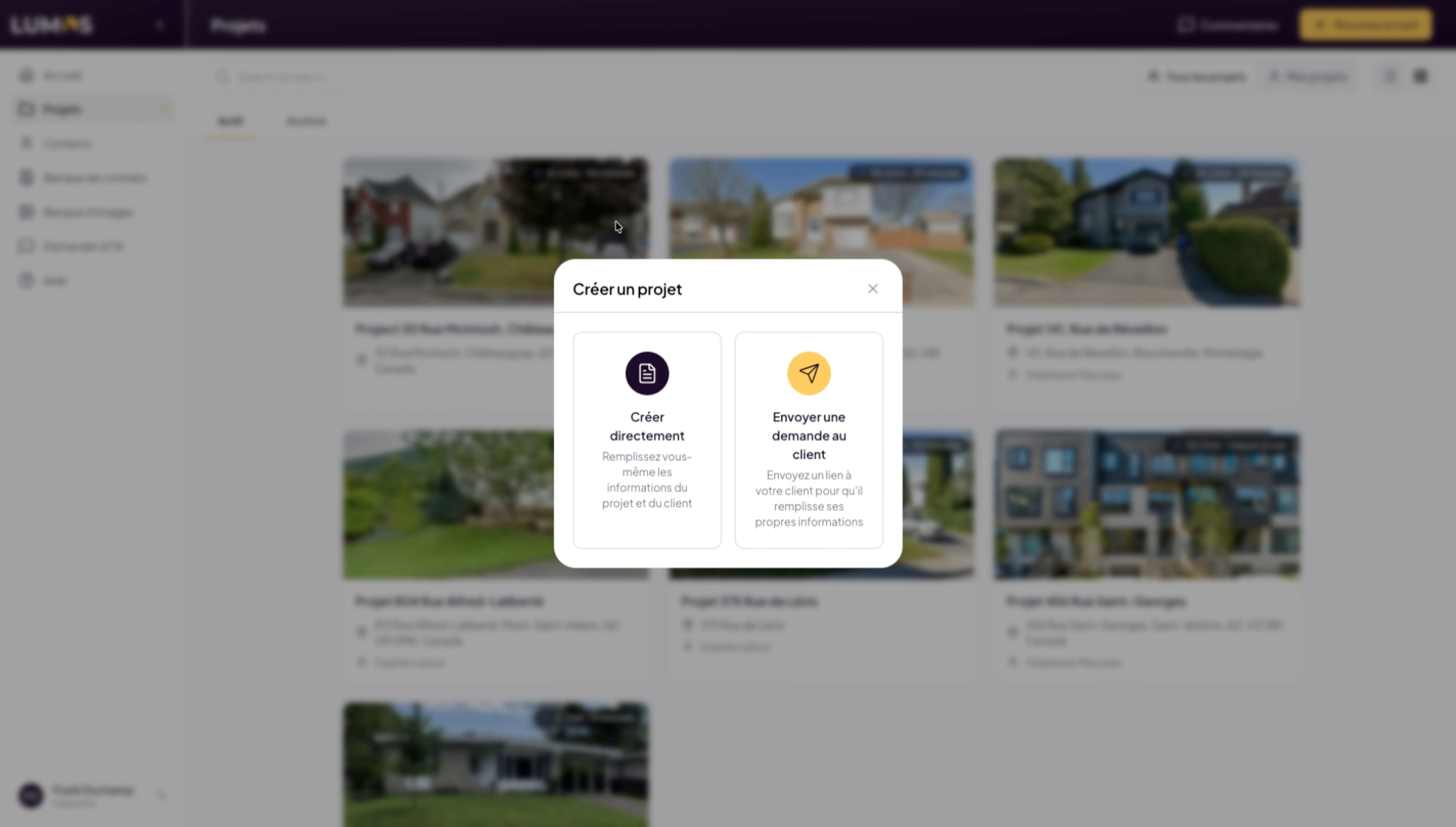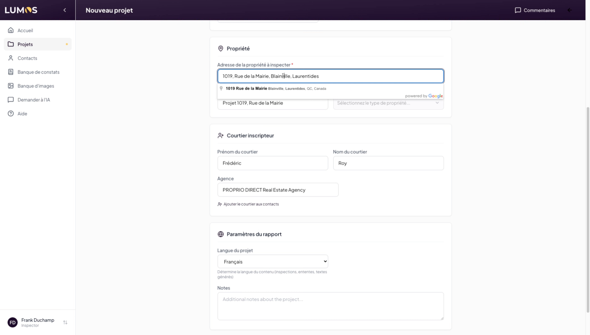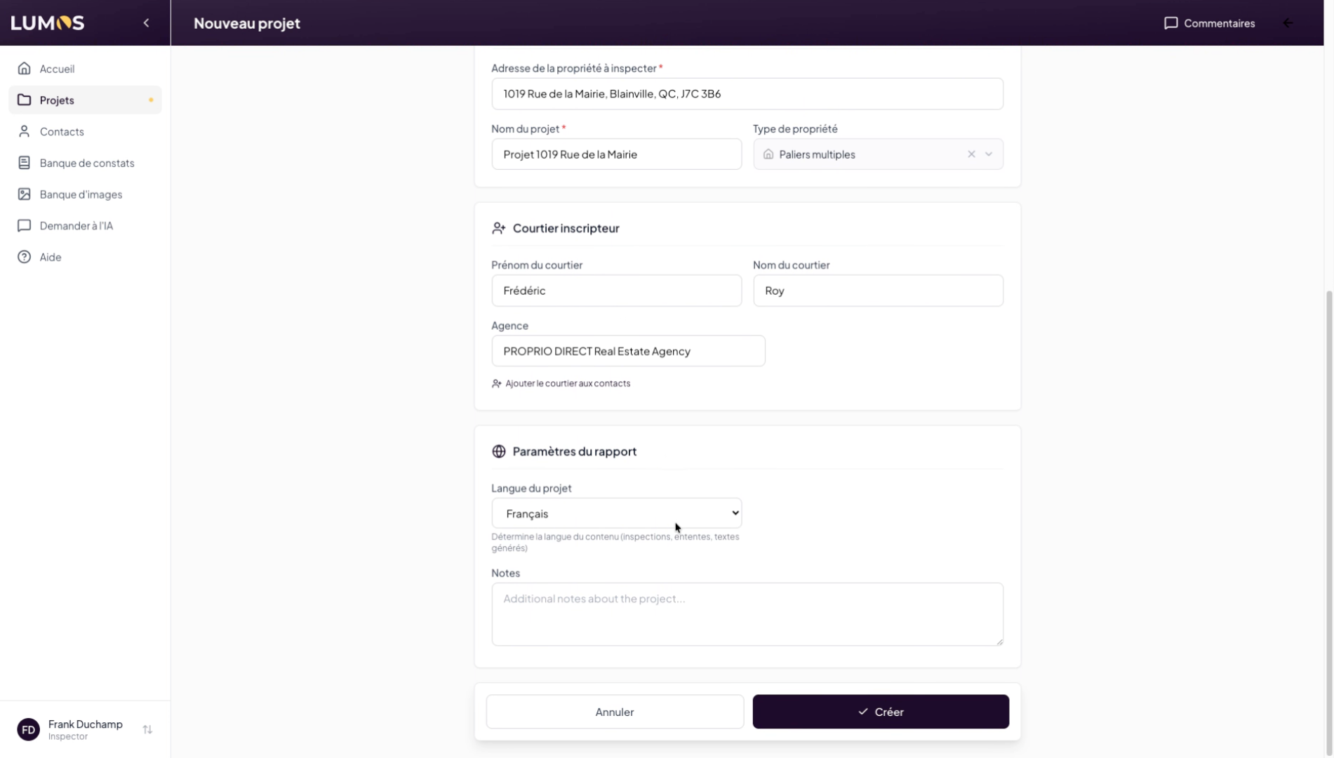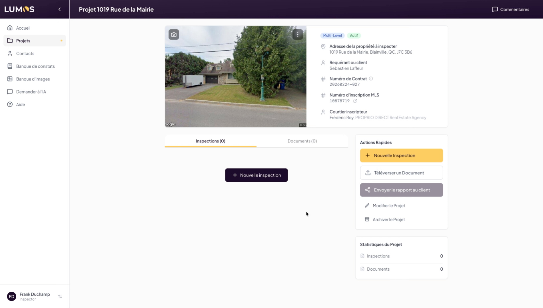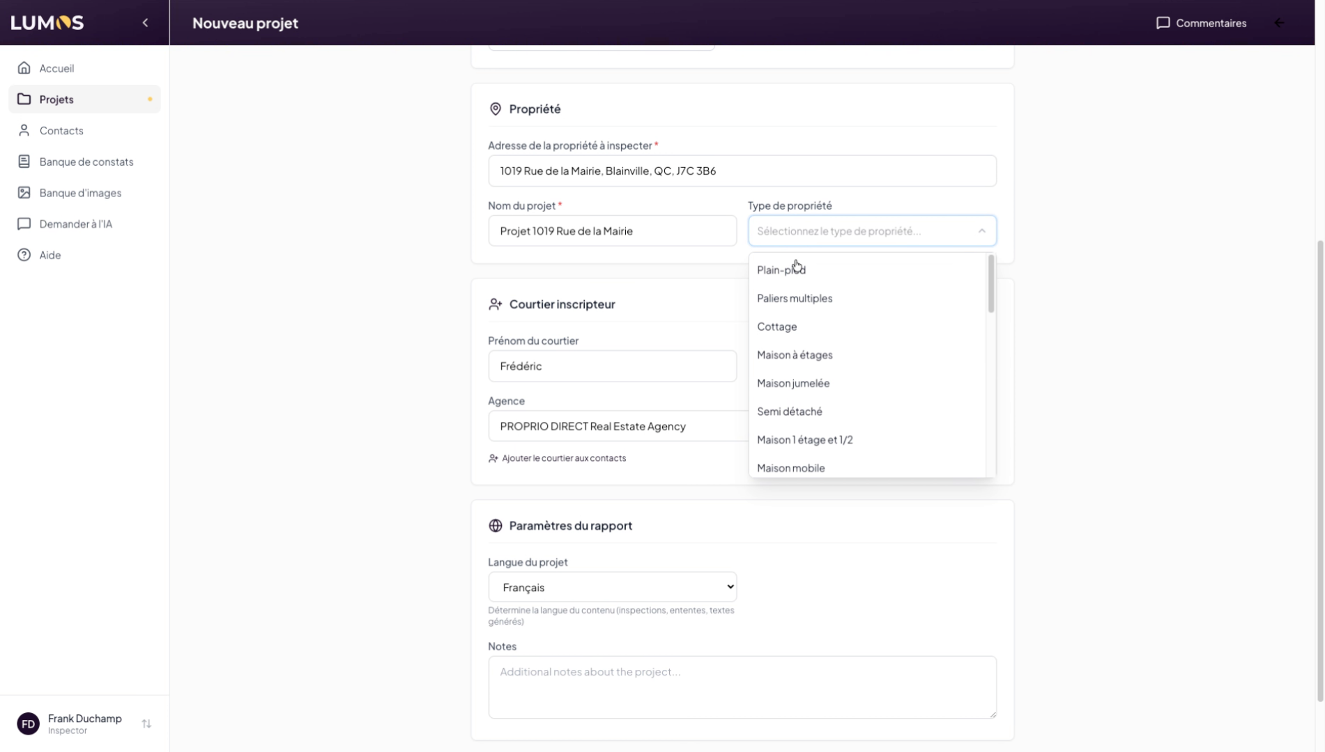 This tutorial guides you through creating a project in the Lumos Inspection application. You will learn how to use the different options available to configure a project linked to a specific address.