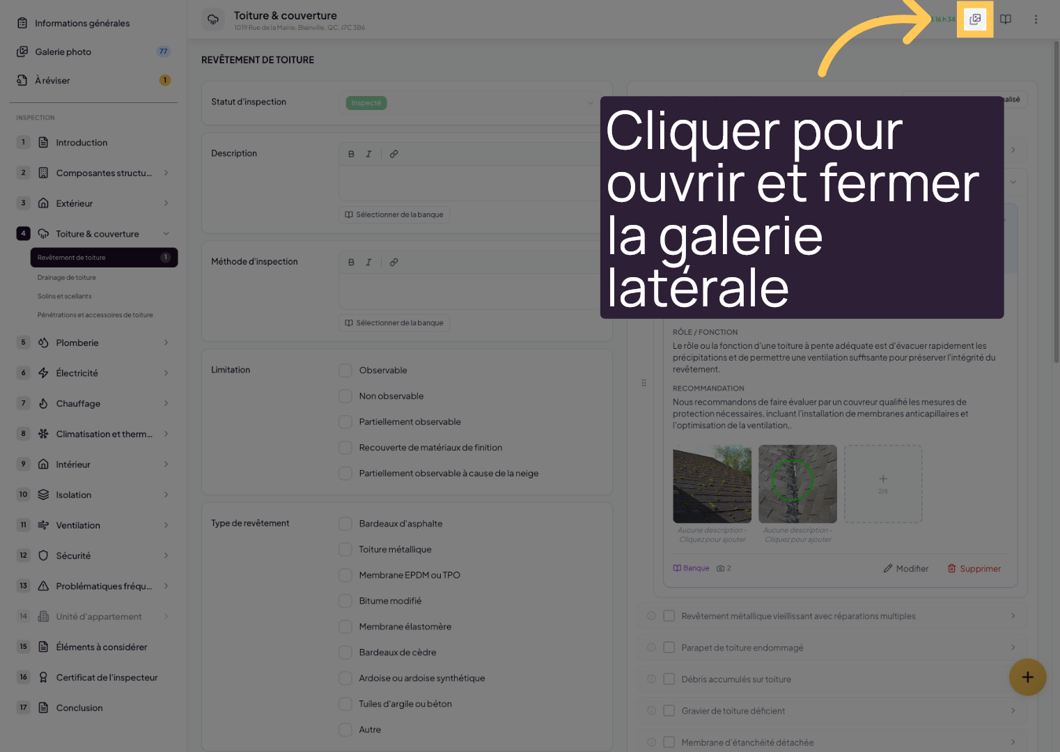 This tutorial explains how to easily and quickly access your photo gallery at any time, from any section of your inspection report.