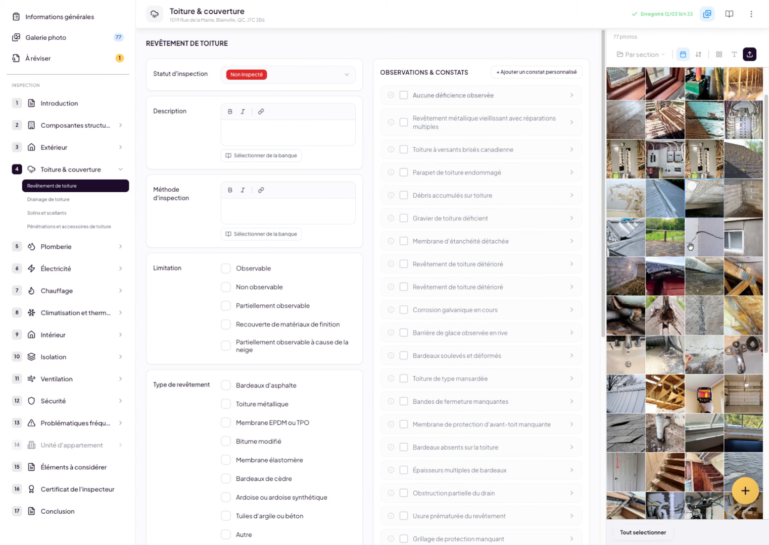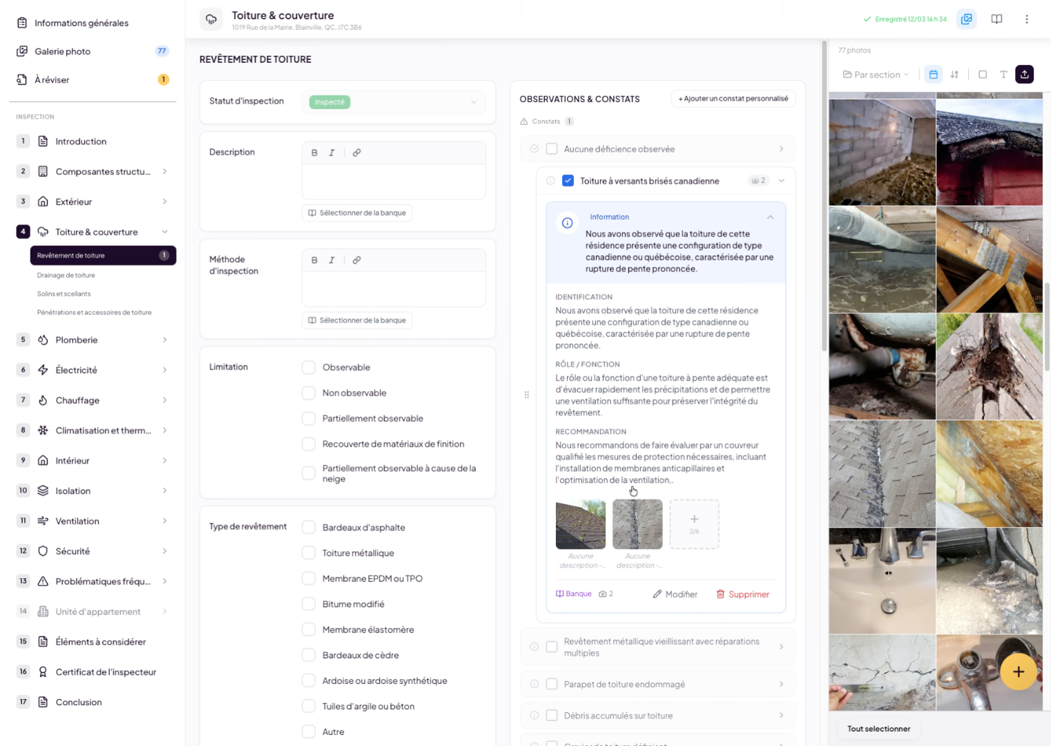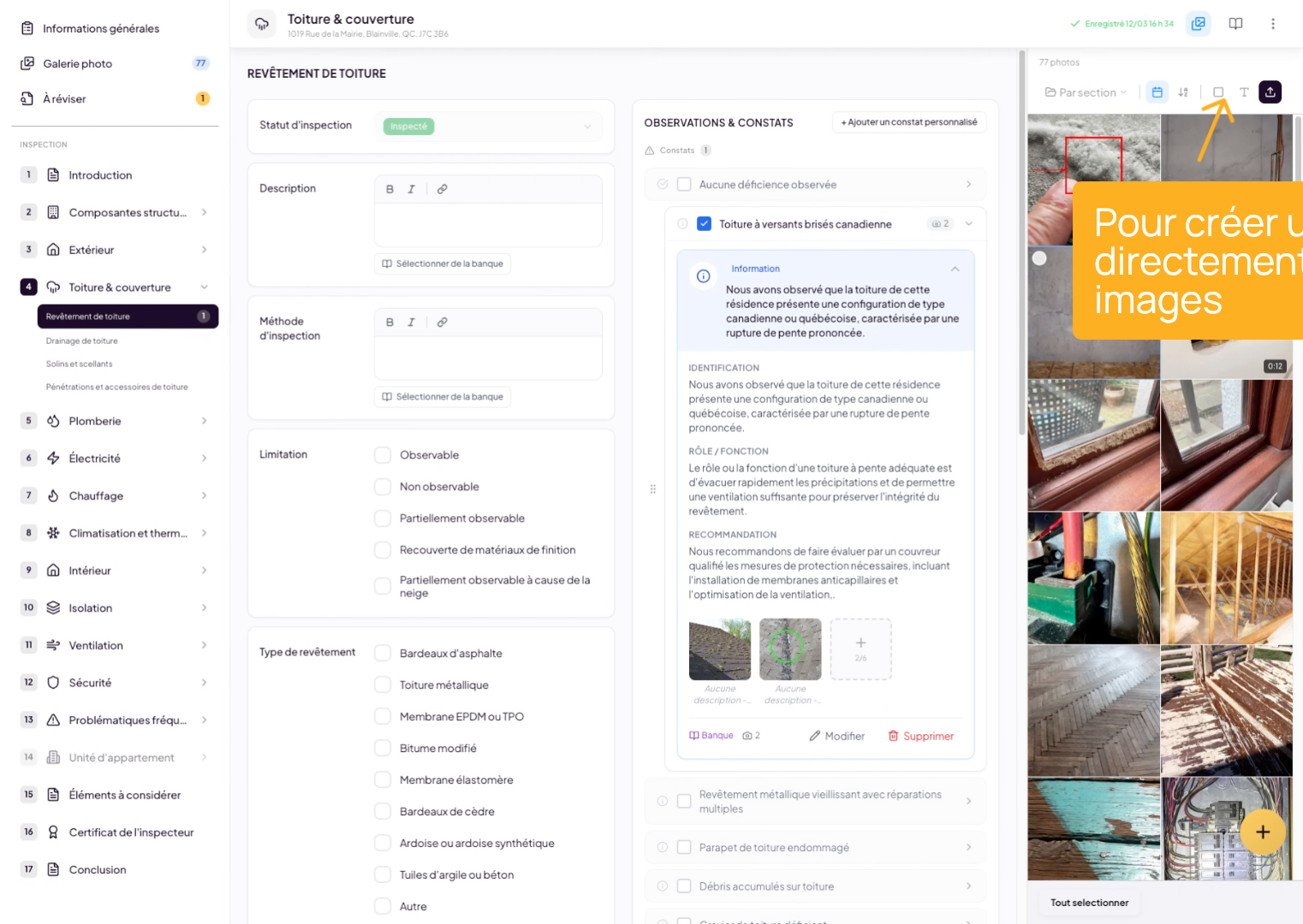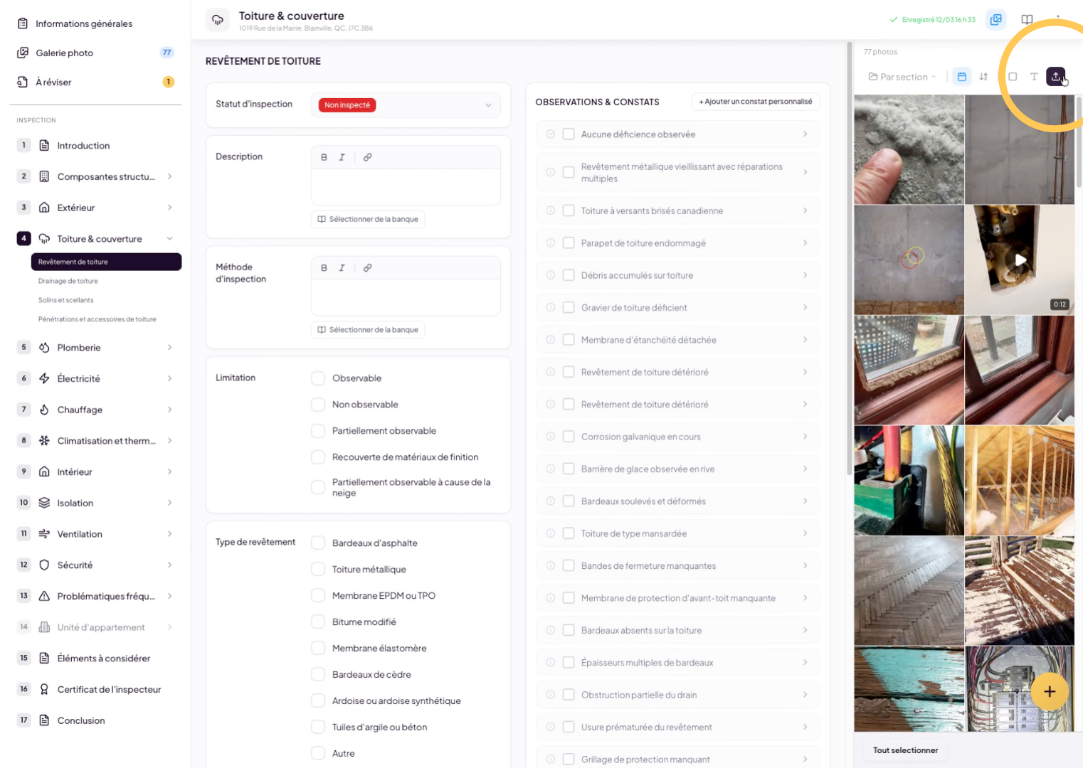 You can quickly access photos at any time. As you navigate through your inspection report, you’ll find an icon in the top-right menu that allows you to open your photos anytime. Simply click on it and all your photos will appear in a sidebar on the right side of the screen.